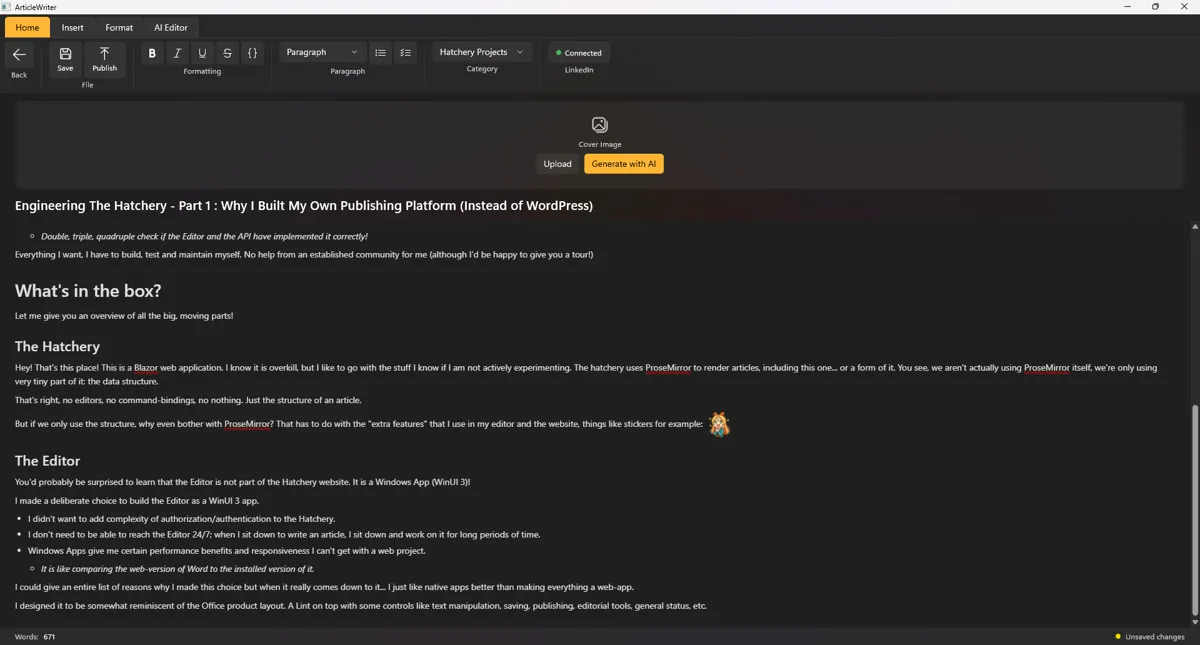 I designed it to be somewhat reminiscent of the Office product layout. A ribbon on top with controls like text manipulation, saving, publishing, editorial tools, and general status. We'll take a deeper dive into the Editor and its features some other time. But just for your idea, here is what it looks like: