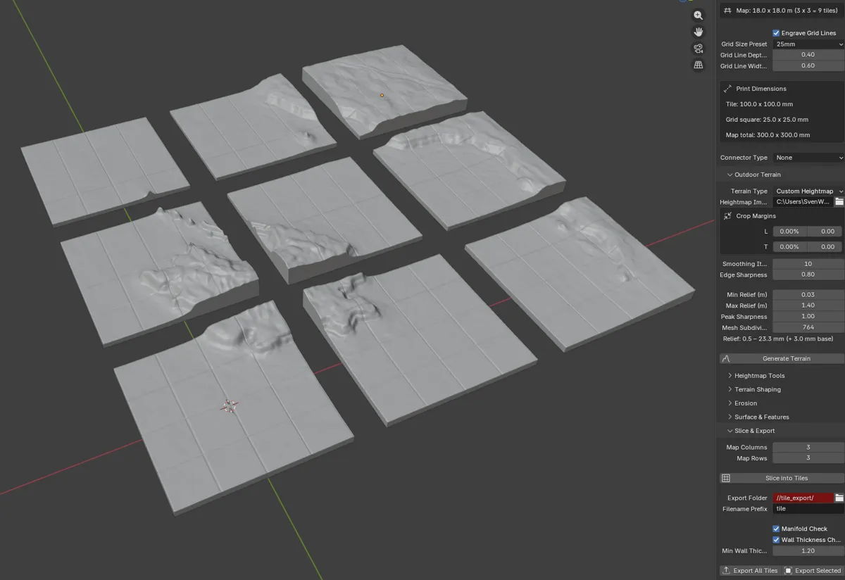 That's why we also have the ability to cut this world into slices, the plugin will even tell you how many slices you need based on different dimensions of the represented world and the physical dimensions for a tile. In the current configuration, we'd need 9 tiles.